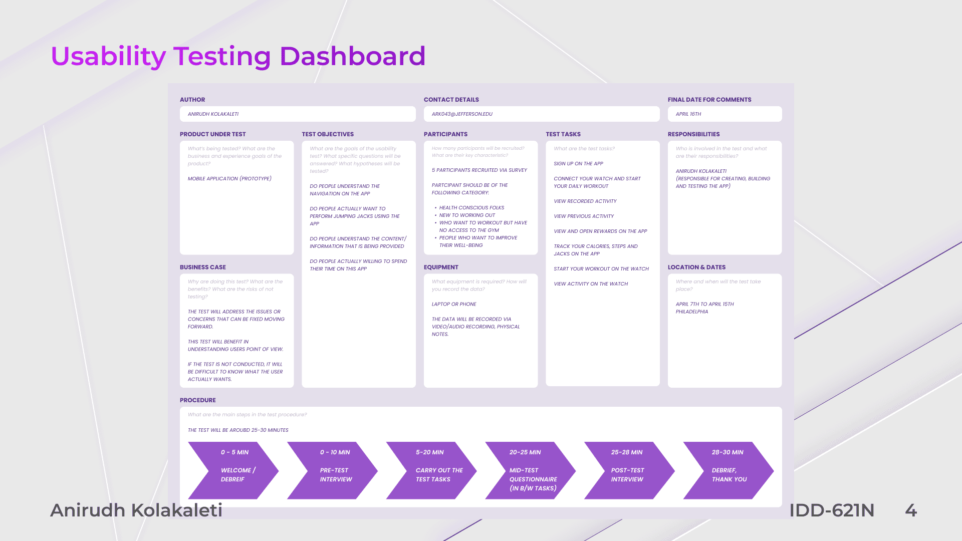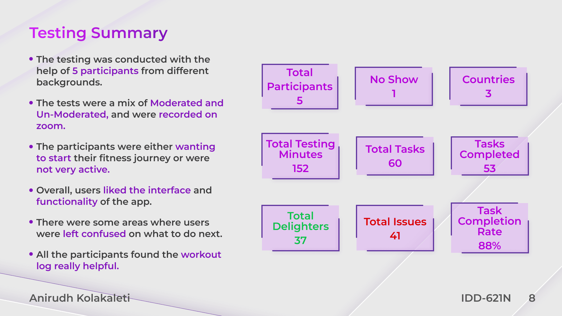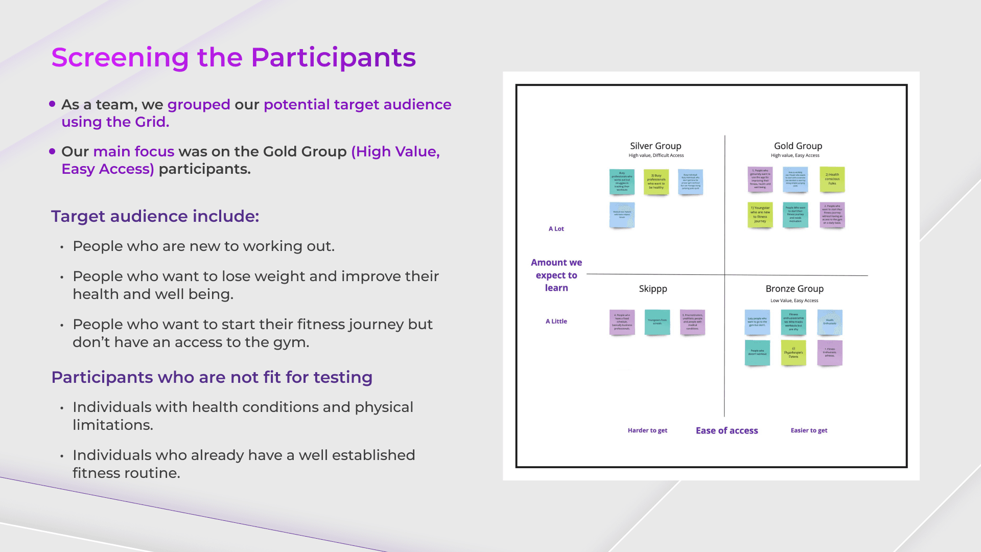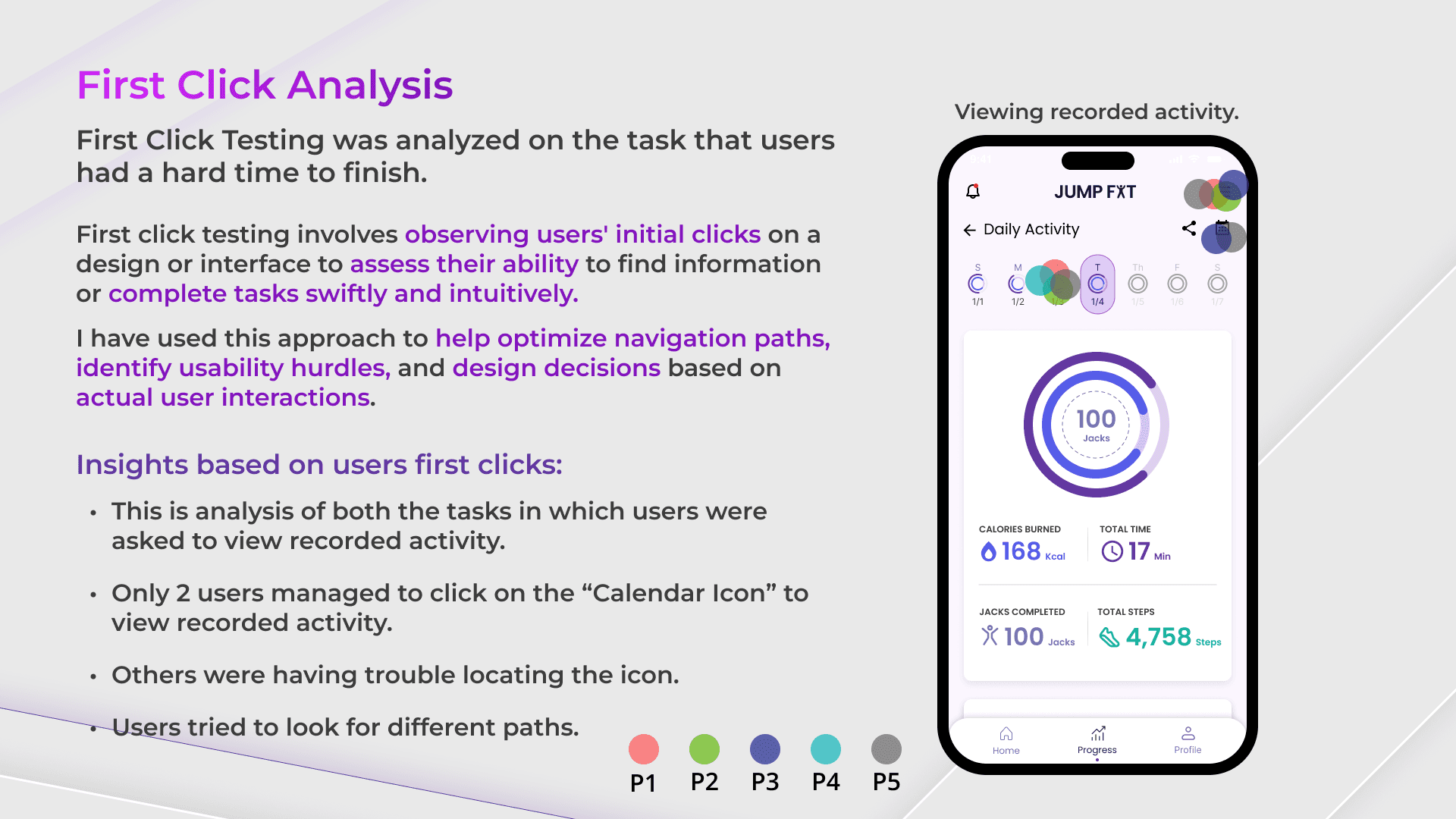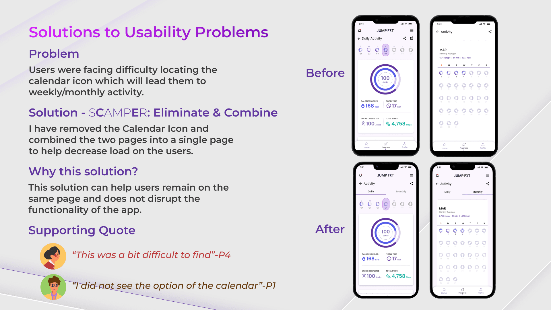 I conducted extensive user testing, documenting the entire process to track insights and iterations. Using techniques like prioritizing issues, time on task, first-click analysis, and the SCAMPER method, I identified key usability challenges and refined the design based on user feedback. This iterative approach ensured that Jump Fit evolved into an intuitive, engaging, and habit-forming fitness app.