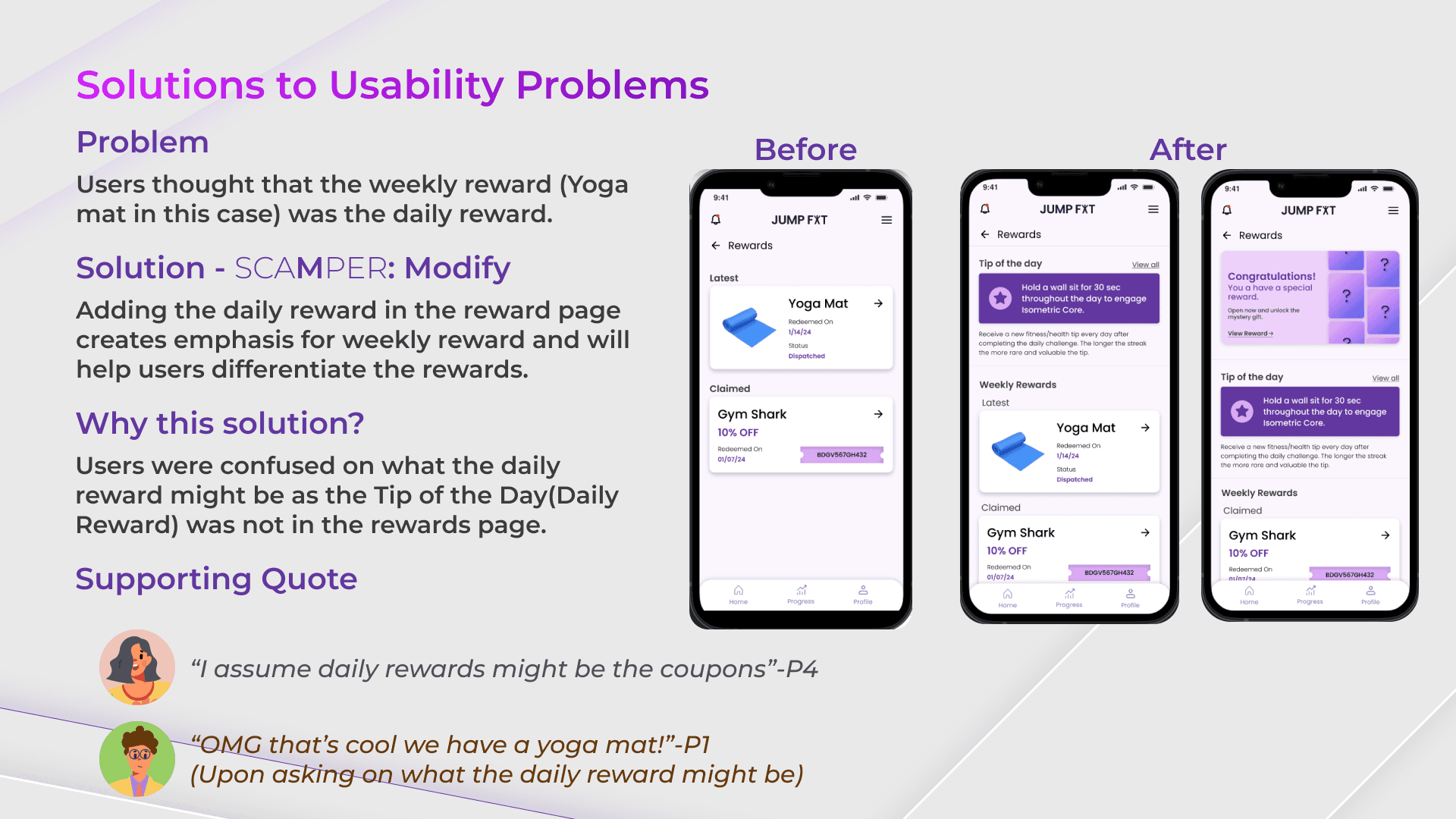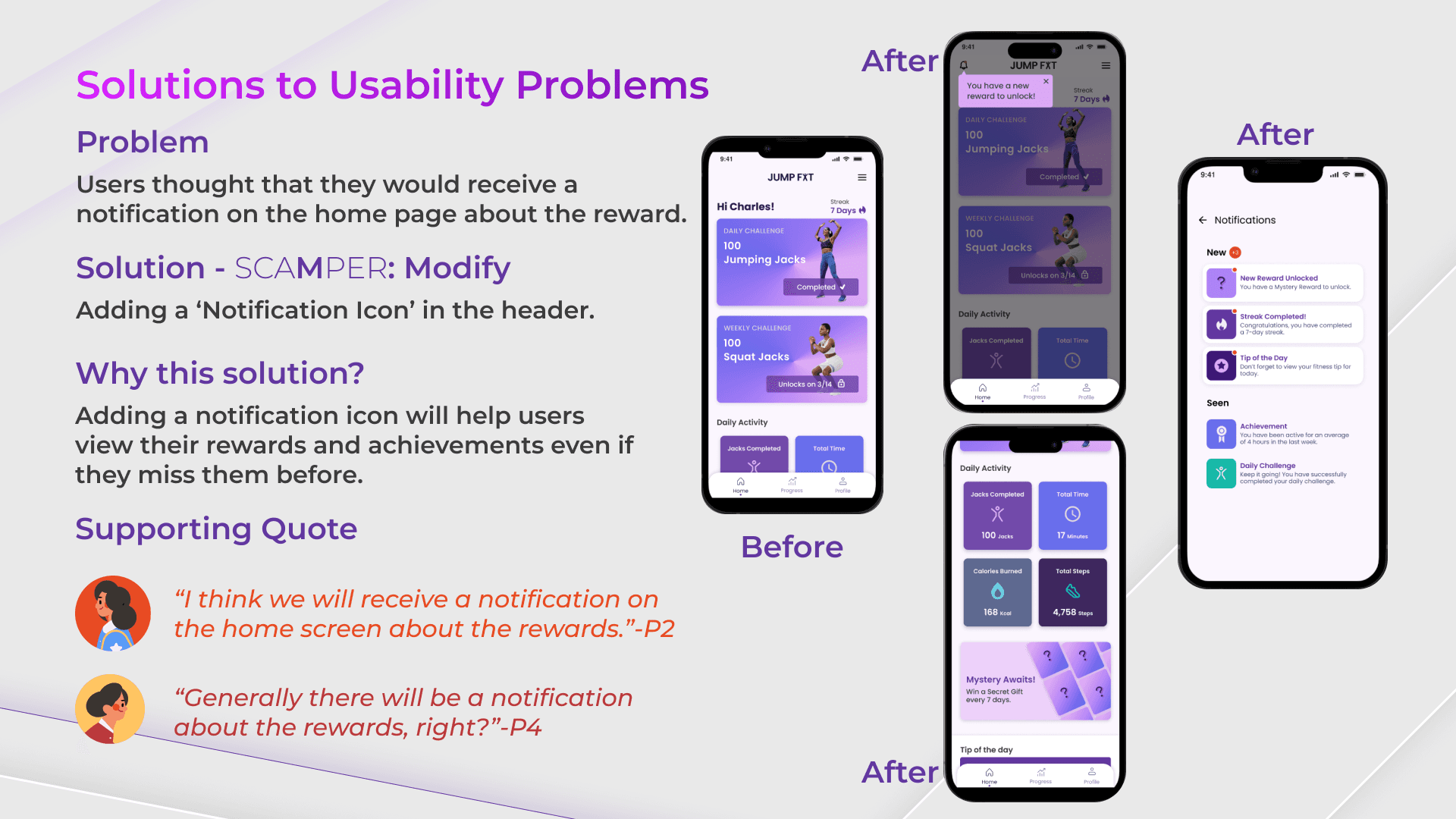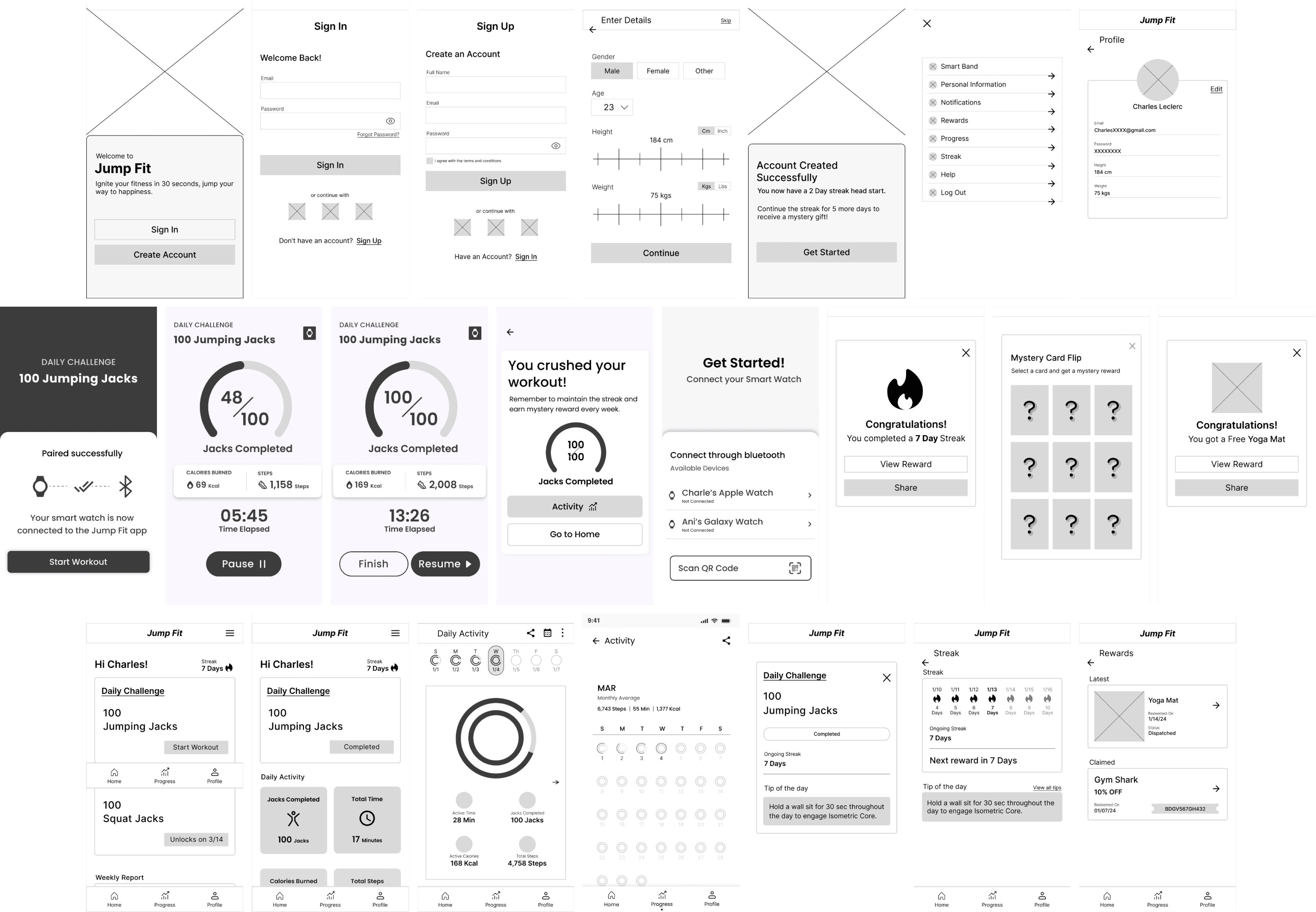 To bring Jump Fit to life, I conducted 5 usability tests and iterated on the design based on direct user feedback. This rigorous process helped refine the gamification methods, ensuring every element, from health tips to mystery gift rewards, resonated with users.