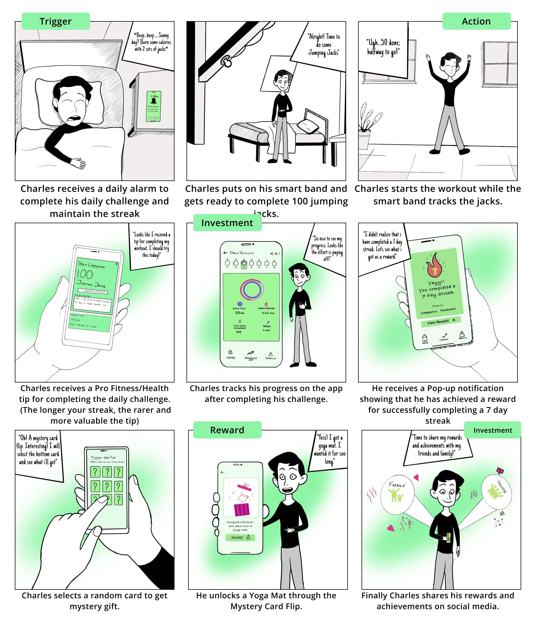 Visualizing the user journey, I created a storyboard to map out how users interact with Jump Fit, from opening the app to forming a daily workout habit.